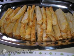 Hozzávalók: 500 g fagyasztott, leveles tészta 10 dkg reszelt sajt só 1 tojás a kenéshez Elkészítése: A leveles tésztát kiolvasztjuk, majd kinyújtjuk 1/2 cm vastagra. Megkenjük felvert tojással, szórjuk meg reszelt, sózott sajttal. Kissé nyomkodjuk rá, majd éles késsel vékony, hosszú csíkokra vágjuk. Így tegyük az előkészített tepsibe, amibe tegyünk sütőpapírt. 200 fokos sütőbe toljuk, […]