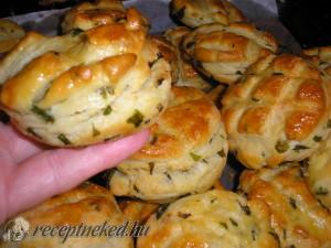 Hozzávalók: 50 dkg búzaliszt 1 ek só 25 dkg vaj/margarin 1 tojás 18 dkg tejföl (20%-os) 50 ml zsíros tejszín 1 csipet kristálycukor 25 g élesztő (friss) Hajtogatáshoz: 10 dkg margarin 5 dkg medvehagyma A kenéshez: 1 tojás Elkészítése: A lisztbe tesszük a margarint, hozzáadjuk a többi hozzávalót, és géppel összegyúrjuk. Egy nylon tasakba tesszük, […]