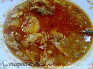 Hozzávalók: 500 g hal (kárász, ponty, harcsa) 2 vöröshagyma fűszerpaprika 2 gerezd fokhagyma 1 paprika 1 paradicsom 1 krumpli zsír só csípős paprikakrém Elkészítése: Az apróra vágott vöröshagymát kevés zsíron megfonnyasztjuk, hozzáadjuk a kockára felvágott paradicsomot, meghintjük fűszerpaprikával és kevés vízzel felöntjük. Pár percig együtt forraljuk majd berakjuk a halszeleteket is. Hozzáadjuk a csíkokra felvágott […]