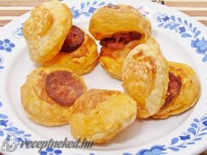 Hozzávalók: 1 kg leveles tészta (2 csomag) 1 pár kolbász 2 tojás sárgája 10 dkg reszelt sajt Elkészítése: A fagyasztott leveles tésztát kiolvasztom, majd lisztezett deszkán vékonyra (3-4 mm) kinyújtom. A karikára vágott kolbászokat a tészta szélétől 5 centiméterre felsorakoztatom, köztük 3 centis közöket hagyva, majd a tészta szélét visszahajtom rá. Úgy szaggatom ki pogácsaszaggatóval, […]
