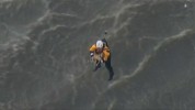 Magával ragadott egy kutyát a heves esőzésektől megduzzadt Los Angeles folyó Kaliforniában. Egy helikopterről leengedett tűzoltó mentette ki az ebet.