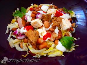 Hozzávalók: 1 konzerv bab 1 jégsaláta 50 dkg sertéscomb 2-3 lilahagyma erős Pista 200 g fetasajt 1 natúr joghurt egy kisebb szál szárazkolbász sertéssült fűszerkeverék étolaj a sütéshez Elkészítése: A húst kockára vágom, megszórom a fűszerkeverékkel és kevés étolajon készre sütöm. Amikor majdnem készre sült hozzáadom a karikára vágott kolbászt. A fetát kockára vágom, a […]