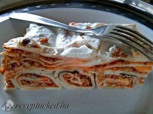 Hozzávalók: Palacsinta: 40 dkg liszt 2 tojás 1 dl étolaj 1 kk só 1,5 dl tej szódavíz Töltelék: 50 dkg darált hús 1 fej vöröshagyma 2 gerezd fokhagyma 1/2 dl étolaj 1 ek fűszerpaprika 1 kk oregánó vagy bazsalikom 1 kis doboz paradicsompüré só és őrölt bors 1 ek zsemlemorzsa 1 nagy doboz tejföl 5 […]