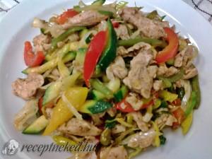 Hozzávalók: 50 dkg csirkemell csont nélkül 1 db közepes cukkini 3 db kaliforniai paprika / zöld, sárga, piros/ 30 dkg ceruzabab ½ fej kisebb fejes káposzta 1 szál póréhagyma 1 kk curry 1 kk gyömbér 1 kk chili só 1 dl szójaszósz 1 kk őrölt fehér bors étolaj Elkészítése: A csirkemellet és a zöldségeket csíkokra […]