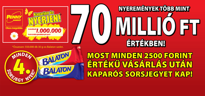 Feltétel: Vásárolj legalább 2500 forint értékben bármely Penny Market üzletben és minden 2.500 forint után 1 db kaparós sorsjegyet kapsz ajándékba a pénztárnál.