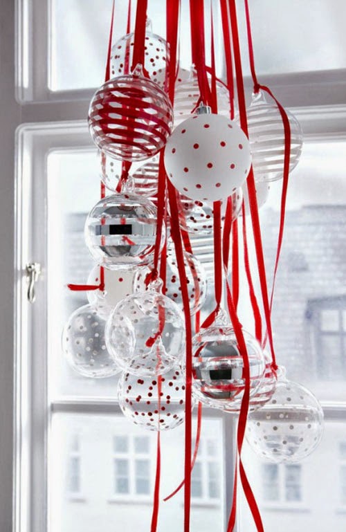 Pár vékony szalag és azonos tónusú gömbdíszből remek lógatott dekorációt készíthetünk, mely minden ablakban jól mutat majd. Meg persze falon is :)!