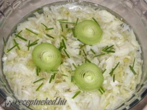 Hozzávalók: 1 fej káposzta cukor ecet őrölt kömény só Elkészítése: A káposztát negyedeljük, a torzsáját kivágjuk, és vékonyan felszeleteljük, vagy legyaluljuk. Besózzuk, és 1 órát állni hagyjuk. 5 dl vízhez ízlés szerint ecetet és cukrot adunk, megszórjuk őrölt köménnyel, és felforraljuk. A lesózott káposztát jól kinyomkodjuk, egy tálba tesszük, és leforrázzuk a salátalével. Ha kihűlt […]