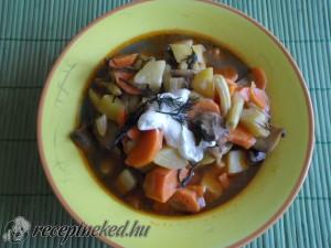 Hozzávalók: 50 dkg zöldbab 30 dkg gomba 1 közepes vöröshagyma 3 közepes sárgarépa 20 dkg burgonya 1 közepes fehérrépa só ízlés szerint bors ízlés szerint 2 l víz 3 szál kapor 1 tk fűszerpaprika 5 ek napraforgó olaj Elkészítése: A vöröshagymát megpucoljuk, felkockázzuk, olajon megdinszteljük, és meghintjük fűszerpaprikával. Rátesszük a megpucolt és felkockázott burgonyát, a […]