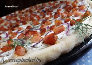 Hozzávalók: Tésztához: 30 dkg liszt 1 tk só 1,7 dl langyos víz 2 dkg friss élesztő 1 púpos tk tyúkzsír megolvasztva (esetleg 2 ek olaj) Szószhoz: 4 púpos ek tejföl 1 nagy csipet só 1 nagy csokor friss kapor Feltéthez: 1 kisebb fej lila hagyma 25 dkg húsos szalonna Elkészítése: A tésztához az élesztőt a […]