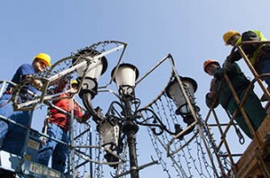 Karácsony 2014: elkezdték felszerelni a karácsonyi díszkivilágítást Kecskemét főterén.
