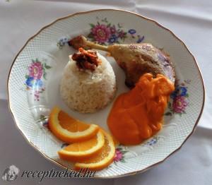 Hozzávalók: 2 kacsacomb 2 narancs+1 a díszítéshez 2kisebb sárgarépa babérlevél pár szem szegfűszeg őrölt bors só pár csepp rozmaringolaj Mártáshoz: 1 kisebb fej hagyma 0,5 kg sütőtök 1 dl tejszín 5 dkg vaj vagy olívaolaj só bors Elkészítése: A kifacsart narancsok levébe beletesszük a szegfűszeget, babérlevelet, karikára vágott sárgarépát, rozmaringolajat. Ebbe a pácba beletesszük a […]