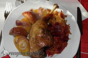 Hozzávalók: 8 kacsacomb 1,5 kg burgonya 2 fej lilahagyma 2 fej vöröshagyma 2 alma 1 tk majoranna 1 dl rozé bor só ízlés szerint Elkészítése: A kacsacombokat megtisztítjuk, a felesleges zsiradékot levágjuk róla, és besózzuk. A krumplit meghámozzuk, a kisebbeket félbe, a nagyobbakat több darabba vágjuk, és lerakjuk az előzőleg beáztatott cserépedény aljára. Enyhén megsózzuk. […]