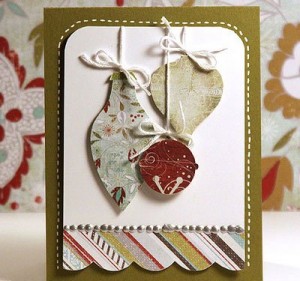 A fodros részt is ragaszd le szalvettával, felső szélére ragassz kristályköveket, apró gyöngyöket vagy egyéb díszítő elemeket. A díszekre köss fehér zsinórból akasztót és illeszd a fehér kartonalap mögé. Az egészet ragaszd a zöld kartonra.