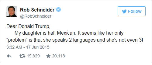 A lányom félig mexikói. Az egyetlen ‘problémája’, hogy két nyelvet beszél és még nem múlt három éves sem.”