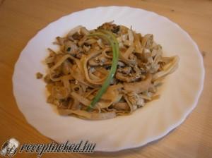 Hozzávalók: 250 g szélesmetélt tészta 10 dkg gomba (ha van shiitake, ha nincs a csiperke is tökéletes) 20 dkg csirkemellfilé 3 tojás 1 csokor újhagyma 2 evőkanál szezámolaj 5 evőkanál szójaszósz 1 kanál étkezésí keményítő só cukor chili Elkészítése: A csirkemellet csíkokra szeljük, majd víz és étkezési keményítő keverékébe egy éjszakára bepácoljuk. A pácolt csirkemellfilét […]