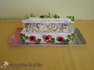 Hozzávalók: Hússalátához: 80 dkg burgonya 20 dkg zöldborsó 2 közepes sárgarépa 4 tojás 40 dkg párizsi 10 ek majonéz 2 dl tejföl 3 közepes újhagyma 2 gerezd fokhagyma só ízlés szerint bors ízlés szerint Ládikóhoz: 0,5 kg rozskenyér 5 ek tejföl 1 közepes piros kaliforniai paprika 3 dkg fekete olajbogyó 4 szál petrezselyem Elkészítése: Hússaláta […]