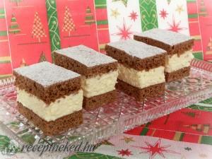 Hozzávalók egy 22*32 cm-es tepsihez: Tészta: 45 dkg liszt 5 dkg margarin 15 dkg porcukor 1 cs vaníliás cukor 2 ek méz 2 tojás 2 ek kakaópor 1 kk szódabikarbóna 1 kk sütőpor 1-2 ek tejföl Krém: 3 cs tejszín ízű pudingpor 1 ek liszt 7 dl tej 20 dkg porcukor 2 cs vaníliás cukor […]