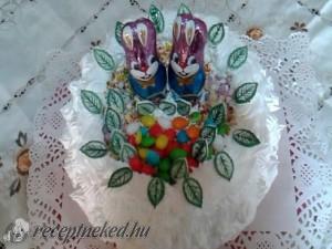 Hozzávalók: 10 tojás 30 dkg cukor 30 dkg vagdalt dió 4 ek liszt 0,5 l tej 2 csomag vaníliás pudingpor 12 ek cukor 25 margarin 10 dkg kókuszreszelék kb. 5 dkg csokoládé Díszítés: 2 csoki nyuszi színes cukorka virágok kavics cukor 10 dkg kókuszreszelék zöld ételfesték 0,5 l habtejszín Elkészítése: Piskóta: 5 db tojásfehérjét felverünk […]