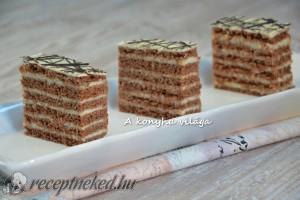 Hozzávalók: Tésztához: 50 dkg liszt 10 dkg cukor 15 dkg vaj 3 dkg kakaópor 2 dkg szalalkáli 2 tojás 3 ek tejföl Krémhez: 1 l tej 25 dkg cukor 6 dkg liszt 20 dkg vaj 14 dkg kókuszreszelék Tetejére: 10 dkg fehér csokoládé 3 dkg étcsokoládé Elkészítése: A vajat elmorzsoljuk a liszttel, majd hozzáadjuk a […]