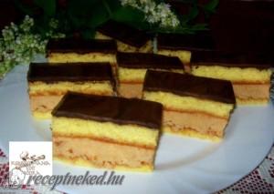 Hozzávalók: Piskótához: 6 tojás 6 ek víz 12 ek cukor 12 ek finomliszt 0,5 csomag sütőpor Krémhez: 4 dl tej 3 ek liszt 15 dkg cukor 1 csomag vaníliás cukor 20 dkg kókuszreszelék 15 babapiskóta 1 rum aroma 20 dkg vaj Lapok lekenéséhez: fél üveg baracklekvár (40 dkg) A mázhoz: 10 dkg étcsokoládé 1 ek […]