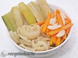 Hozzávalók: 2 kg cukkini 3 sárgarépa 2 nagyobb fej hagyma nagy csokor kaporszár vagy friss kapor 5 gerezd fokhagyma 1 kisebb chili 2 ek só 2 szelet kenyér vagy 3 krumpli Elkészítése: A cukkinit meghámozzuk, egyforma hasábokra vágjuk. A hagymát felkarikázzuk, a sárgarépát hosszabb hasábokra vágjuk. A sárgarépát rövid ideig forró, sós vízben blansírozzuk, hogy kicsit […]