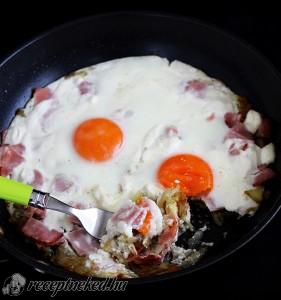 Hozzávalók: 2 krumpli 10 dkg sonka 2 tojás 2-3 ek tejföl só őrölt fehér bors 3 dkg vaj 1 ek olívaolaj Elkészítése: A krumplit pucoljuk meg, majd reszeljük le egy nagyobb lyukú reszelőn. A sonkát vágjuk fel ízlés szerint. (Én a vékonyra szeletelt sonkát kisebb kockákra vágtam.) Egy serpenyőben hevítsük fel a vajat és az […]