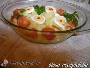 Hozzávalók: 1 kg krumpli vöröshagyma borecet (vagy sima) só bors cukor snidling Elkészítése: A krumplit héjában megfőzzük. Ha kihűlt, karikára vágjuk. A karikára szelt hagymát leforrázzuk, és megsózzuk. A hagymát és a krumplit rétegenként egy tálba tesszük, és erősen ízesített dresszinget (víz, cukor, só, ecet ízlés szerint) öntünk rá. 3-4 órát állni hagyjuk, majd tálaljuk.