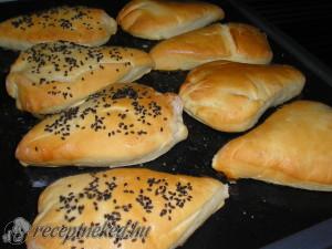 Hozzávalók: A tésztához: 20 g étolaj 20 g kristálycukor 20 g só 30 g élesztő (friss) 180 g tejföl 200 ml víz 1 gerezd fokhagyma 100 g búza-rétesliszt (BFF 55) 150 g kukoricaliszt 450 g búzaliszt (BL55) A kenéshez: 100 ml tej (2,8%-os) 1 ek fekete szezámmag (elhagyható) Elkészítése: A fokhagymát belereszeljük a lisztekhez. A […]