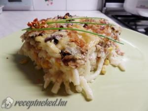 Hozzávalók: A majonézhez: 1 nagy jó minőségű majonéz (420g) vagy házilag: 3 tojássárgája Olaj Só Cukor Mustár Citromlé Őrölt bors A tésztához: 1 csomag makaróni tészta Nagy dobozos tejföl (350-375 g) 2 doboz édes kukorica 40 dkg sonka (gép, csirkemell, pulyka, mindegy) 1 doboz vagy üveg szeletelt gomba 20 dkg Trappista sajt 3-4 szelet Bacon szalonna […]