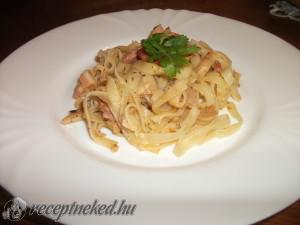 Hozzávalók: Raguhoz: 1 fej vöröshagyma 1 ek olívaolaj 10 dkg bacon szalonna 20 dkg gomba bors 3 paradicsom bazsalikom 2 kis gerezd fokhagyma 10 dkg natúr krémsajt Tésztához: 25 dkg tészta – széles metélt 1 ek étolaj só Elkészítése: A vöröshagymát apró kockára vágjuk, és kevés olajon megpirítjuk. A bacont felszeleteljük csíkokra, a hagymára dobjuk, […]