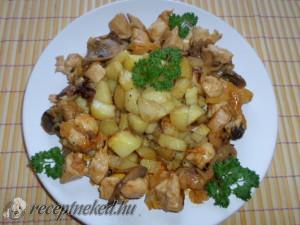 Hozzávalók: 80 dkg csirkemell filé 3 közepes vöröshagyma 7 közepes paprika 5 ek napraforgó olaj 2 közepes paradicsom 1 teáskanál fokhagymapor só ízlés szerint 1 db gombakonzerv Elkészítése: Egy nagyobb serpenyőben az olajat felhevítjük. Rátesszük a cikkekre szeletelt vöröshagymát. Egy kicsit megfonnyasztjuk, majd hozzáadjuk a felkarikázott paprikát és a cikkekre szeletelt paradicsomot. Kb 10 perc […]