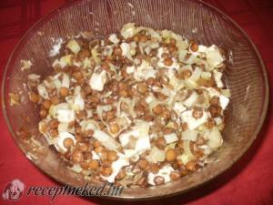 Hozzávalók: 30 dkg lencse hagyma 1 nagyobb gerezd fokhagyma 1 tk bazsalikom 1 tk oregánó 1 tk őrölt babérlevél 1 dl olívaolaj fél dl fehér borecet 10 dkg fetasajt só,bors Elkészítése: A lencsét lábasba tettem, sóztam, borsoztam. Ráöntöttem a borecetet és annyi vizet ami éppen ellepte. Puhára főztem és fedő alatt hagytam kihűlni. Amikor kihűlt […]