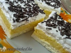 Hozzávalók: Tészta: 8 tojásfehérje 8 ek cukor 8 ek liszt fél csomag sütőpor A krémhez: 20 dkg puha vaj 15 dkg cukor 1 csomag vaníliás cukor 8 dl tej 2 csomag vaníliás pudingpor 8 tojássárgája A tetejére: 3 dl habtejszín csokidara Elkészítése: A cukorral a tojásfehérjét jó kemény habbá verjük, majd hozzákeverjük a sütőporos lisztet. […]