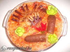 Hozzávalók: 1 nagy bögre rizs 1 dl olaj 3 ek ételízesítő 4 nagy fej hagyma 1 kg lecsópaprika 80 dkg paradicsom 2 szelet házi sonka 1 szál kolbász 1 nagy szelet szalonna 1 kk só 1 ek őrölt pirospaprika 3 gerezd fokhagyma 1 kk őrölt bors 1 kk szódabikarbóna Elkészítése: Olajban megsütjük a sonkát és […]