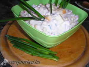 Hozzávalók: 25 dkg konzerv kukorica 15 dkg natúr joghurt (házi) 1 dl majonéz 1 dl tejföl 15 dkg füstölt sajt 1 ek porcukor 2 db salotta hagyma 1 kis csokor metélőhagyma (snidling) só bors 1 szál újhagyma 1 kk citromlé Elkészítése: A kukoricáról a levét leöblítjük, és egy tálkába borítjuk. A salotta hagymákat és a […]