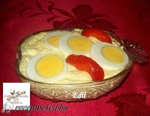 Hozzávalók: 5 keményre főzött tojás só őrölt bors ízlés szerint 2 dl tejföl 1 ek majonéz 1 mk mustár 1 kisebb vöröshagyma reszelve Elkészítése: A tojásokat 8 perc alatt forró, lobogó vízben megfőzzük, majd kihűtjük. A tejfölt a majonézzel, mustárral, borssal, sóval elkeverjük. A hagymát belereszeljük és azzal is elkeverjük. A tojásokat aprítógéppel vagy tojás […]