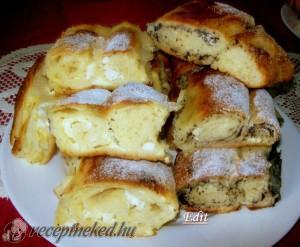 Hozzávalók: 90 dkg finomliszt 6 dl langyos tej 7,5 dkg friss élesztő 1 tk só 2 tojás 1 tk cukor A töltelékhez: 30 dkg tehéntúró 1 ek cukor 6 dl tejföl 1 tojás 10 dkg cukrozott, darált mák A rétes kenéséhez: 3 ek olaj Elkészítése: A lisztet a sóval és a tojással elkeverjük. Az élesztőt […]