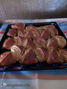 Hozzávalók: 80 dkg liszt 0,5 l tej 5 dkg élesztő 1 dl olaj 2 mk só 3 tojássárgája 1 tojás 25 dkg margarin Elkészítése: A liszthez hozzáadjuk az olajat, a sót, majd a tejben megfuttatott élesztőt. Jól kidolgozzuk, és kelni hagyjuk. A margarint robotgéppel eldolgozzuk a 3 tojássárgájával, és a megkelt, elnyújtott tésztára kenjük. Feltekerjük, […]