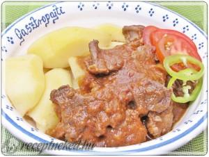 Hozzávalók: 1,5 kg marhalábszár 5 nagy fej vöröshagyma 1 ek zsír 2 zöldpaprika 2 nagyobb paradicsom meghámozva 250 g darált, csípős, sós kápia paprika (vagy őrölt pirospaprika, és megfelelő mennyiségű só) 1 kk köménymag (esetleg őrölt kömény) 1 kk őrölt bors 1 lestyánlevél 1 liter víz Elkészítése: A megtisztított felcsíkozott hagymát 1 ek zsíron, erős […]