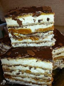 Hozzávalók: Krém: 5 ek cukor 5 csomag vaníliás cukor 3,5 dl tej 1,5 csomag zselatinpor 8 dl habtejszín Karamellszósz: 12 dkg cukor 2,5 dkg vaj csipet só 2 ek víz 0,75 dl habtejszín 1/4 csomag zselatinpor További hozzávalók: 1 cs ostyalap 10 dkg vaj 2 ek méz 10-15 dkg tört pörkölt mogyoró (sótlan) 1,5 dl […]