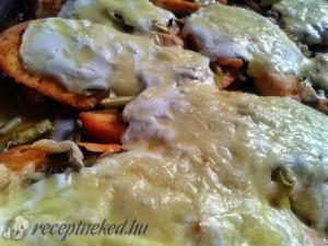 Hozzávalók: 1 kg csirkemell filé 3 ek fokhagymakrém kevés só pár szál medvehagyma 1 nagy tejföl 20-25 dkg sajt reszelve 3 ek olaj Elkészítése: A húst szeletekre vágjuk, egy tálba belerakjuk, rányomjuk a fokhagymakrémet, és jól átkeverjük. Hűtőbe rakjuk kb. 20 percre. Kevés olajat öntünk egy közepes tepsi aljába, rárakjuk a hússzeleteket, majd a sütőben […]