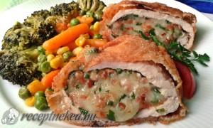 Hozzávalók: 4 nagy szelet karaj csont nélkül 1 csokor medvehagyma 2 db tömlős krémsajt 15 dkg bacon só őrölt fehér bors 20 dkg (teljes kiőrlésű) liszt 2-3 tojás 30 dkg (rozsos) zsemlemorzsa étolaj Elkészítése: A medvehagymát apróra, a bacont kis kockákra vágjuk. A bacont kipirítjuk, és leszűrjük. A hússzeleteket kiklopfoljuk, sózzuk. Az apróra vágott medvehagymát […]