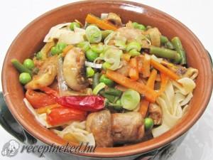 Hozzávalók: 1 szál sárgarépa 4 fej kisebb gomba 1 marék zöldbab 1 marék zöldborsó 1/2 színes paprika 1 db paradicsom 1/2 lilahagyma 1 szál újhagyma só, frissen őrölt bors csilipehely ízlés szerint kevés olíva olaj Elkészítése: Széles metélt (tagliatelle) tésztát tettem fel sós, forró vízben főni. A lila hagymát megtisztítottam, hosszában felcsíkoztam. A sárgarépát csíkokra […]