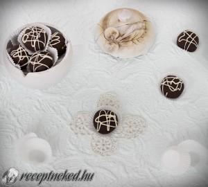 Hozzávalók: Hozzávalók 20-22 db-hoz: 15 dkg mogyoróvaj 7 dkg vaj 12-15 dkg porcukor 1/2 tk vaníliaaroma 5 db babapiskóta 12,5 dkg csokoládé (60 %-os) 5 dkg fehér csokoládé Elkészítése: A mogyoróvajat keverjük alaposan össze a puha vajjal, a porcukorral, a vaníliaaromával, és az összemorzsolt babapiskótával. Ezután tegyük be pár órára a hűtőbe, hogy kissé megdermedjen […]