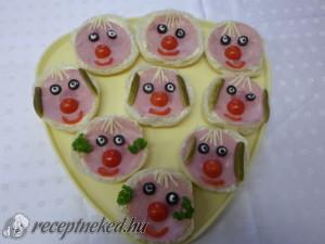 Hozzávalók: 10 zsemle 10 dkg vaj 20 dkg sonkás szalámi 15 dkg koktélparadicsom 10 fekete olajbogyó 10 dkg sajt 20 szem fekete bors 3 közepes csemegeuborka Elkészítése: A zsemléket kettévágjuk, megkenjük vajjal. Mindegyikre teszünk egy-egy szelet szalámit. Elkészítjük az arcukat: kettévágott koktélparadicsom az orruk, egy-egy cikk paradicsom a szájuk. Sajtból vékony szeleteket vágunk ez lesz […]