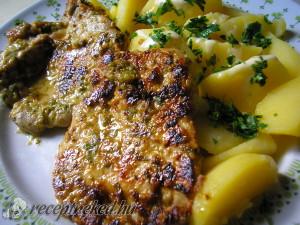 Hozzávalók: 4 szelet karaj A páchoz: 4 evőkanál mustár egy evőkanál olaj 5 gerezd fokhagyma (lereszelve) 1 dl főzőtejszín 1 mokkáskanál őrölt, piros fűszerpaprika 1 mokkáskanál só frissen őrölt bors A körethez: 5 db közepes méretű burgonya 3 szál rozmaring ág kevés vaj Elkészítése: A húst az egyik szélénél 1 cm-es távolságban bevagdaljuk. A pác […]