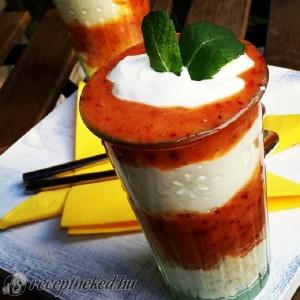 Hozzávalók: 4 db sárga húsú, érett nektarin 1 citrom frissen facsart leve fél citrom reszelt héja 6 levélke menta + a díszítéshez 1 ek nádcukor 25 dkg (lm) túró 3 dl görög joghurt (nálam ez a készítmény nem okoz problémát, de akinél igen, az használjon lm joghurtot) Elkészítése: A túrót összetöröm a cukorral és a […]