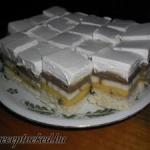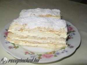 Hozzávalók: 50 dkg fagyasztott leveles tészta 3 csomag vaníliás pudingpor 6 dl víz 5 evőkanál cukor 6 dl tejszín 1 csomag vaníliás cukor Elkészítése: A leveles tésztát szobahőmérsékleten kiolvasztjuk. 4 részre vágjuk, nagyon vékonyra kinyújtjuk (kb 35*24 cm). Előmelegített sütőben sütőpapírral borított tepsi hátulján megsütjük. A pudingot a cukorral és a vízzel elkeverjük, majd megfőzzük. […]