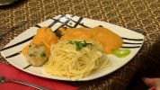 Újházi tyúkhúsleves, vadas marha zsemlegombóccal és spagettivel, forró lávában sült brownie