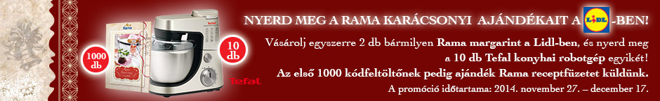Vásárolj az Unilever Magyarország Kft. által forgalmazott Rama margarinok közül 2 darabot a magyarországi Lidl üzleteibenés a tied lehet a 10db Tefal konyhai robotgép vagy az 1000db Rama receptfüzet egyike.